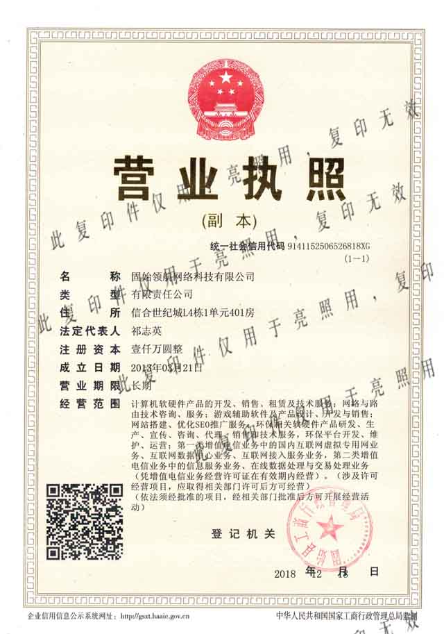 ★★固始领航网络科技有限公司成立于2013年,专注为广大用户提供网游加速服务。公司自主研发的领航加速器采用全网节点覆盖、动态智能路由、流量监控、数据中转、加密通道等新的网络IP技术为广大网游玩家和游戏工作室提供游戏加速和登录服务,有效提高网络速度和稳定性。支持智能选线、手动自由切换线路、批量测速、线路搜索、断线重连、异常断开禁网等功能。支持市场上众多热门游戏。公司秉承“诚信与人,愉快合作,共享共建,携手云航”的企业宗旨,技术精益求精,服务专业快速,资质证件齐全,一直为广大客户提供更好的服务而不懈努力。